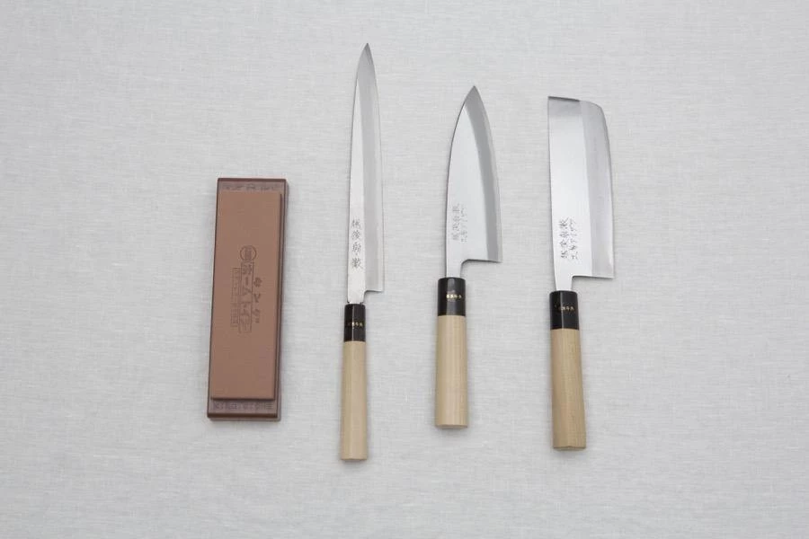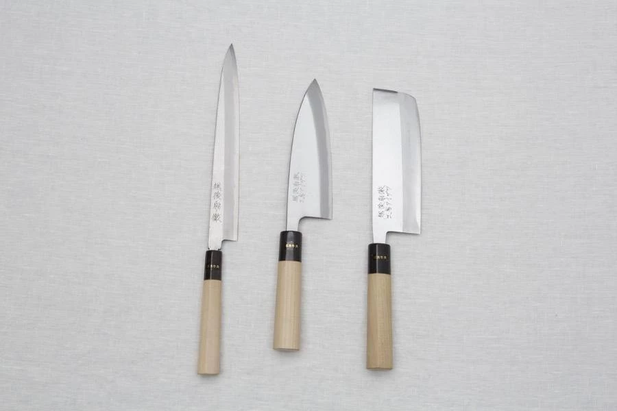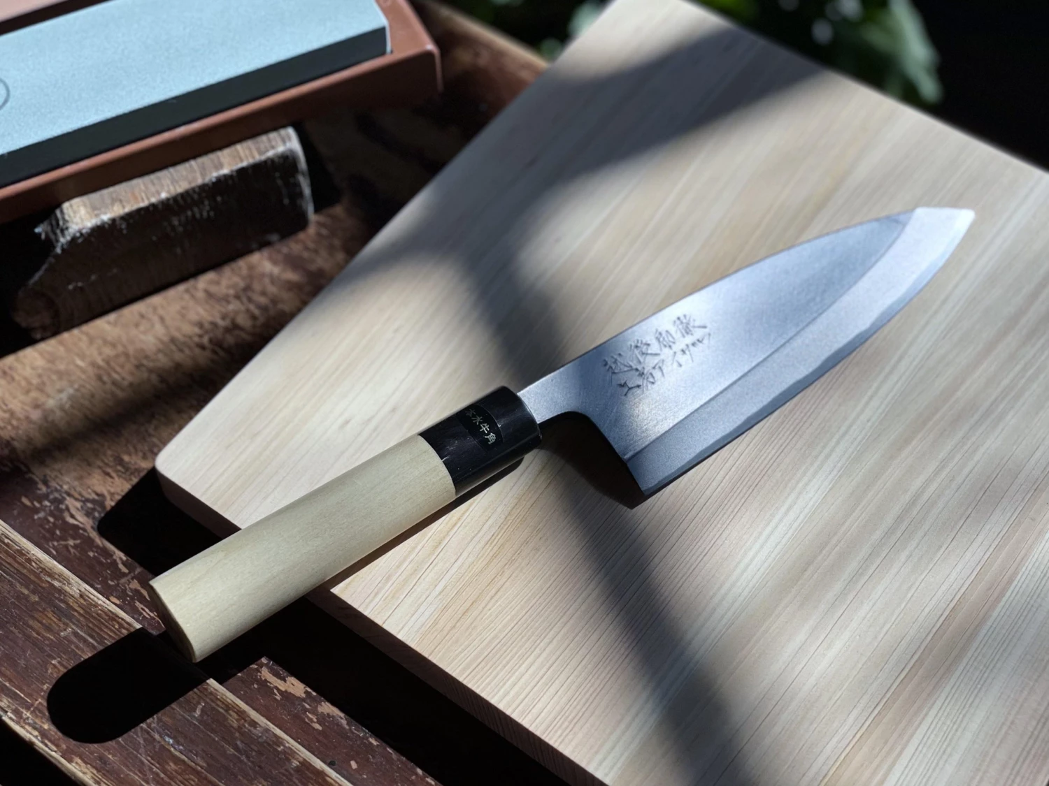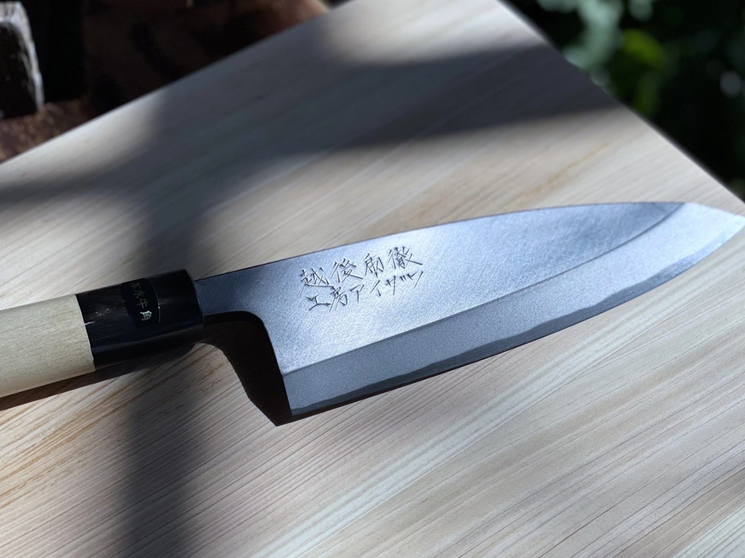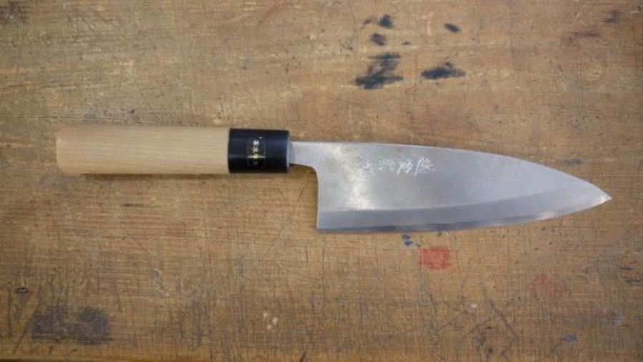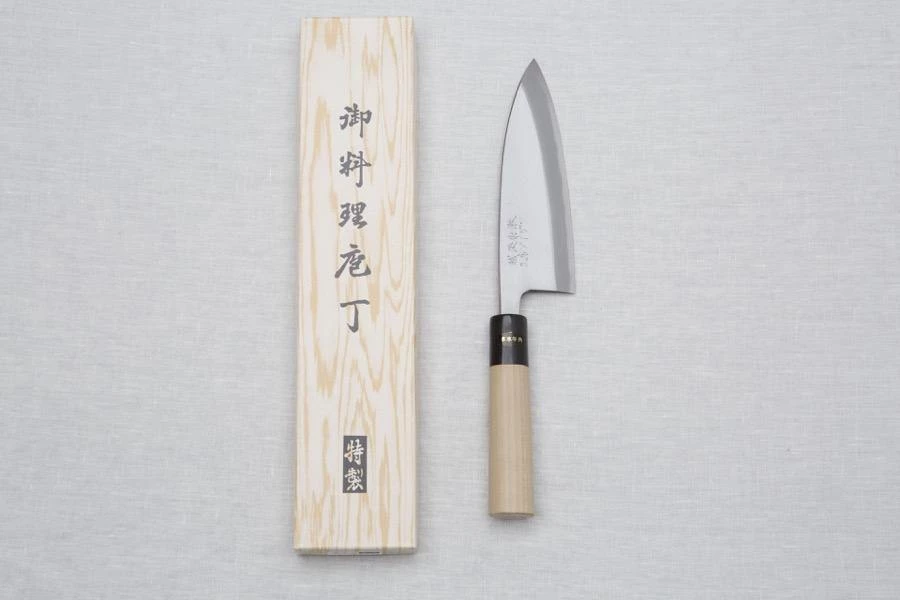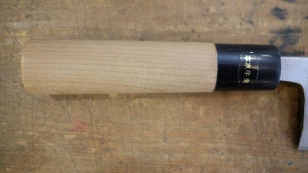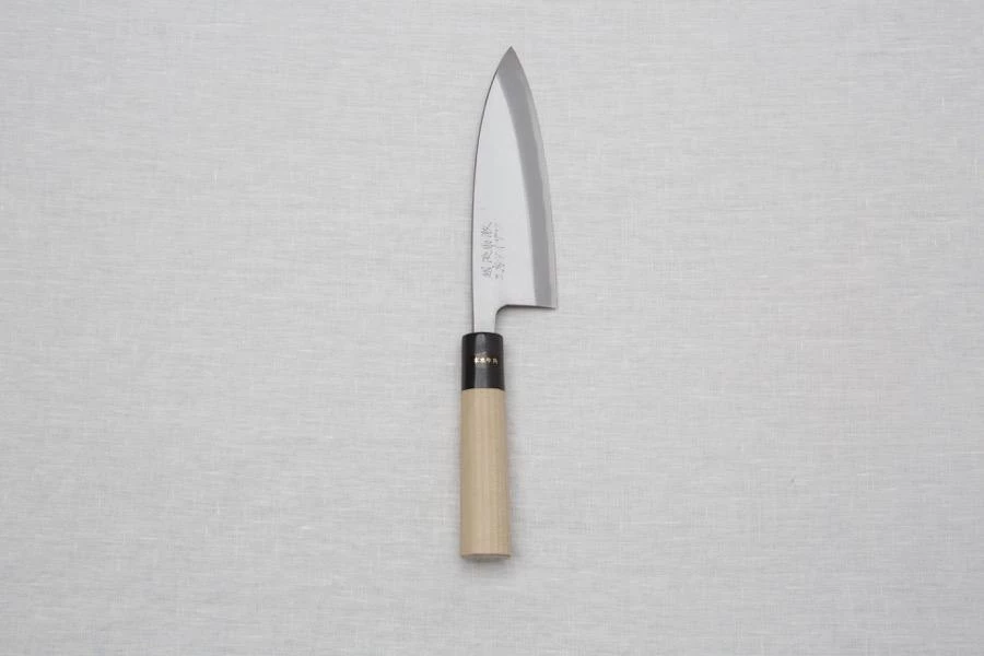 Appearing first during the Edo period in Sakai, the Deba boncho is used for filleting and cutting the heads off fish. It is also handy for cutting chicken and meat. Its thickness and single bevel design enable it to fillet and slice smoothly, and its weight makes sure fish bones and heads cut cleanly and easily. The main work of the blade is used to ride against the fish bones, separating the fillet. The deba can be made in different sizes up to 30cm, but ours is a very comfortable 165mm. It is not intended for chopping large diameter bones.