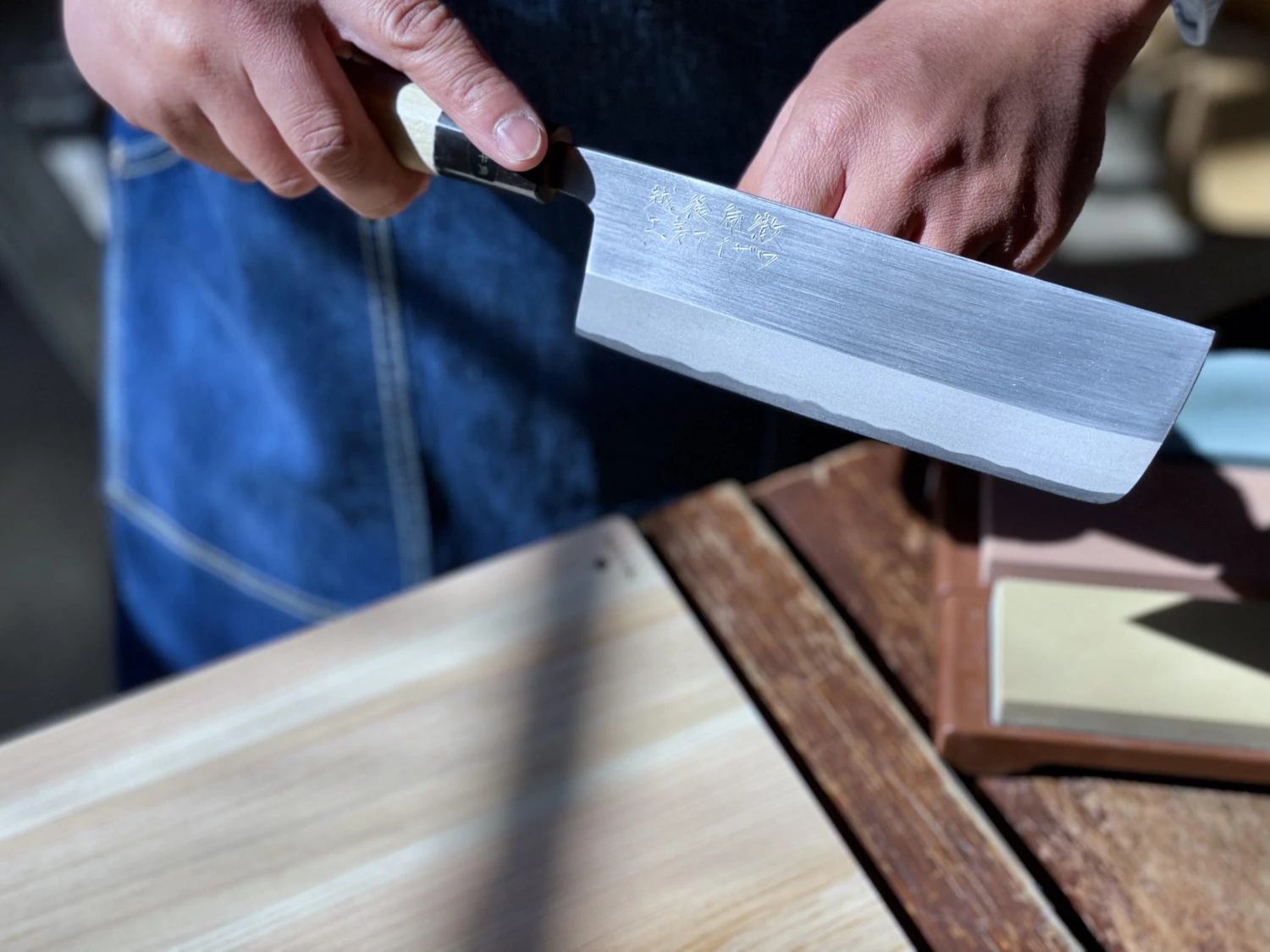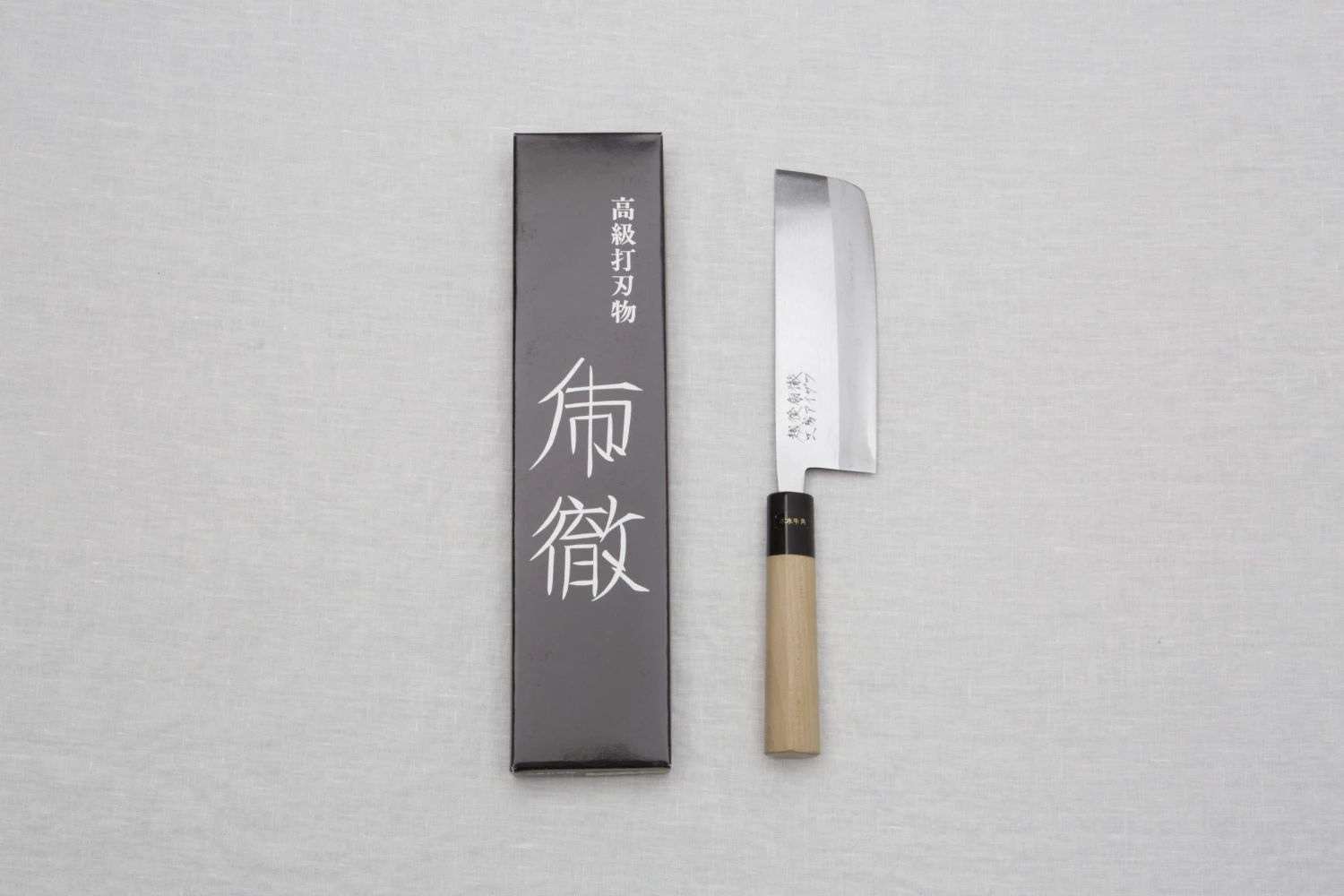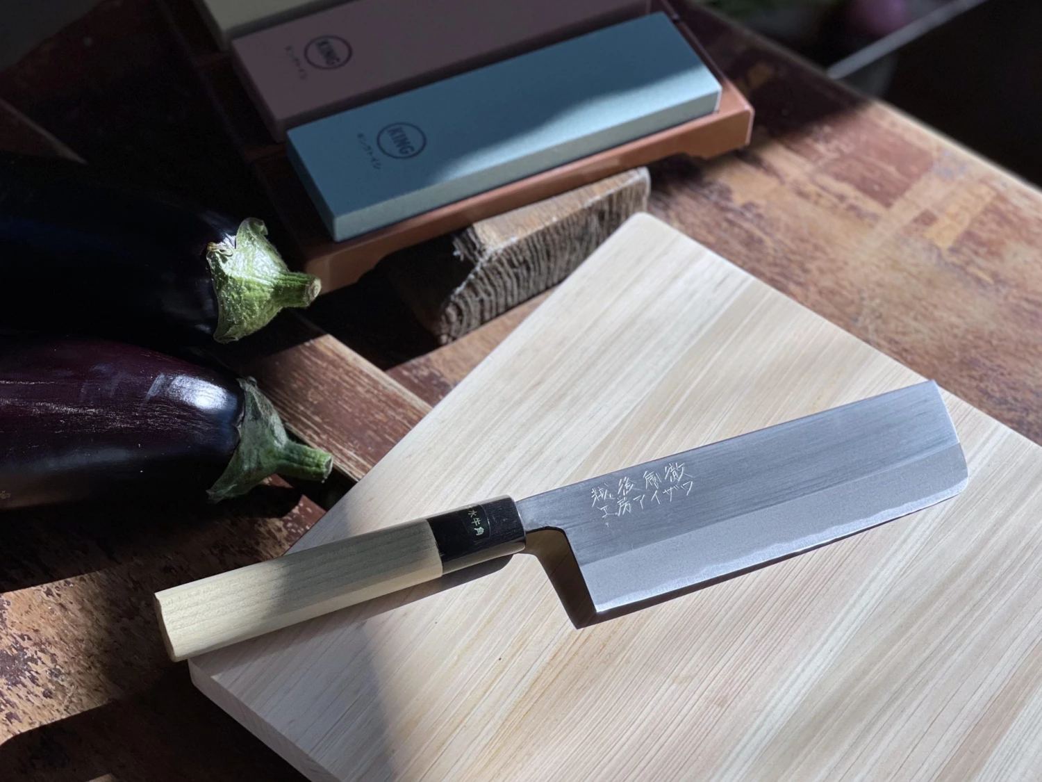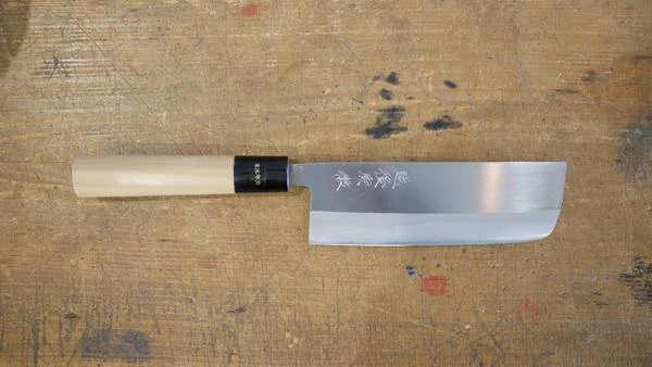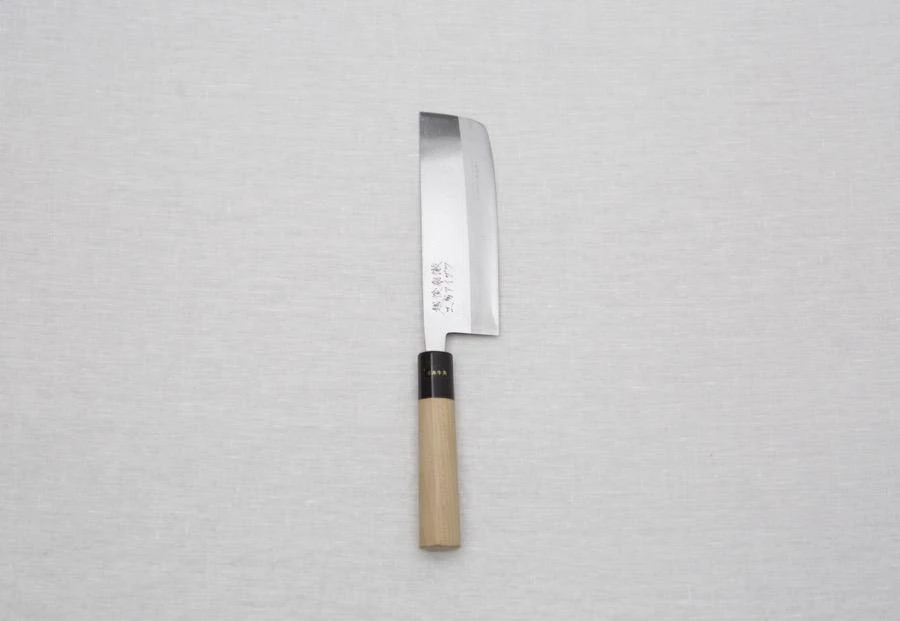 Nakiri is a Japanese-style vegetable knife. They differ from the Deba Hocho in their shape, as they have a straight blade edge suitable for cutting all the way to the cutting board without the need for a horizontal pull or push. These knives are also much thinner, perfect for cutting vegetables and doesn’t have the heft of the deba, a heavy blade for easy cutting through thin bones and not suitable for chopping vegetables as it is a thicker blade can break the vegetable slice.