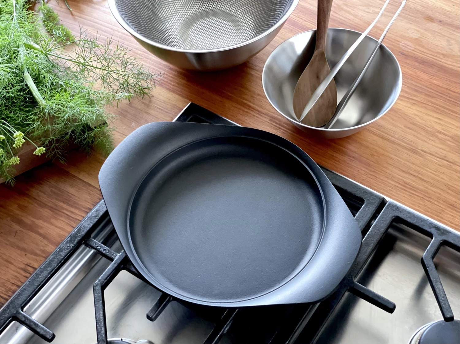 The unique functionality of these pots and pans lie in the shape of a slightly cured edge which makes it easy to pour liquids. The difference between “Nambu Tekki” and normal iron products is the thickness. Nambu Tekki absorbs and distributes the heat evenly. The Nambu Tekki won the prestigious Good Design Award in Japan in 2001.